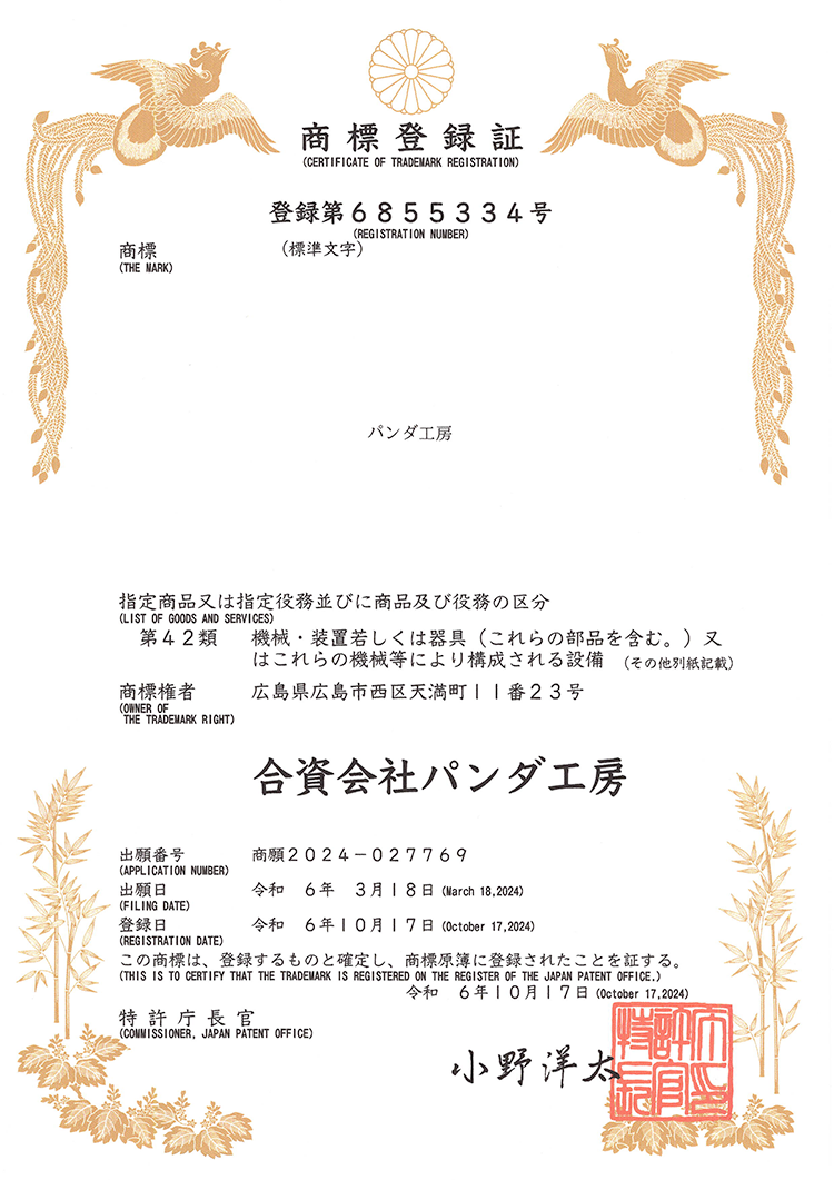 このたび、私たちの会社名「パンダ工房」が、2024年10月17日に特許庁より登録商標として正式に認められました!